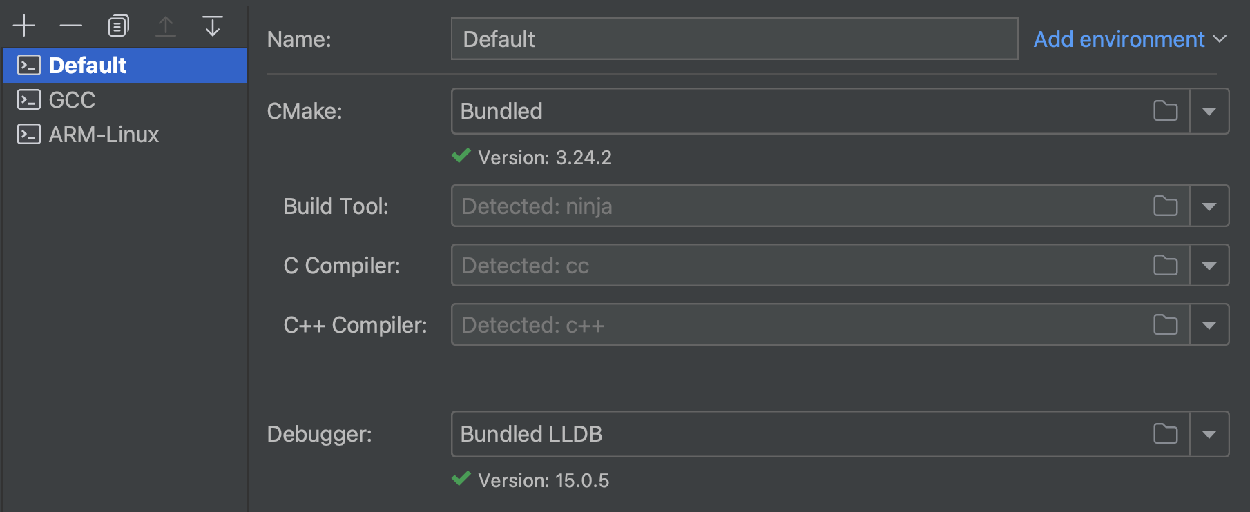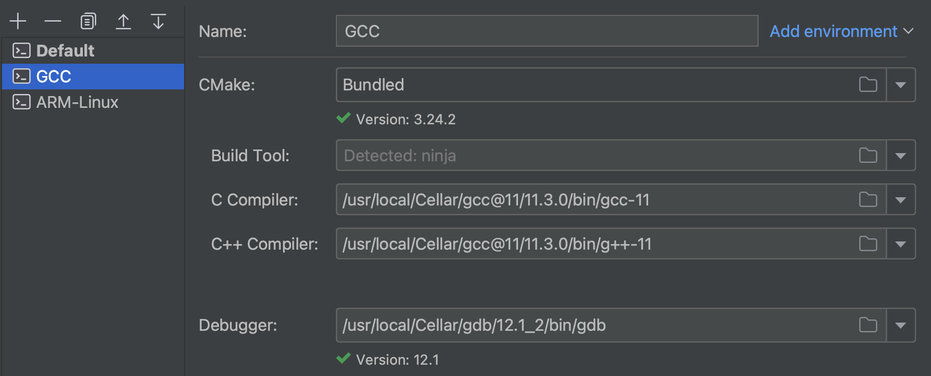 除了默认,我额外配置了2个,都是用的gcc编译器,但是调试器不一样
