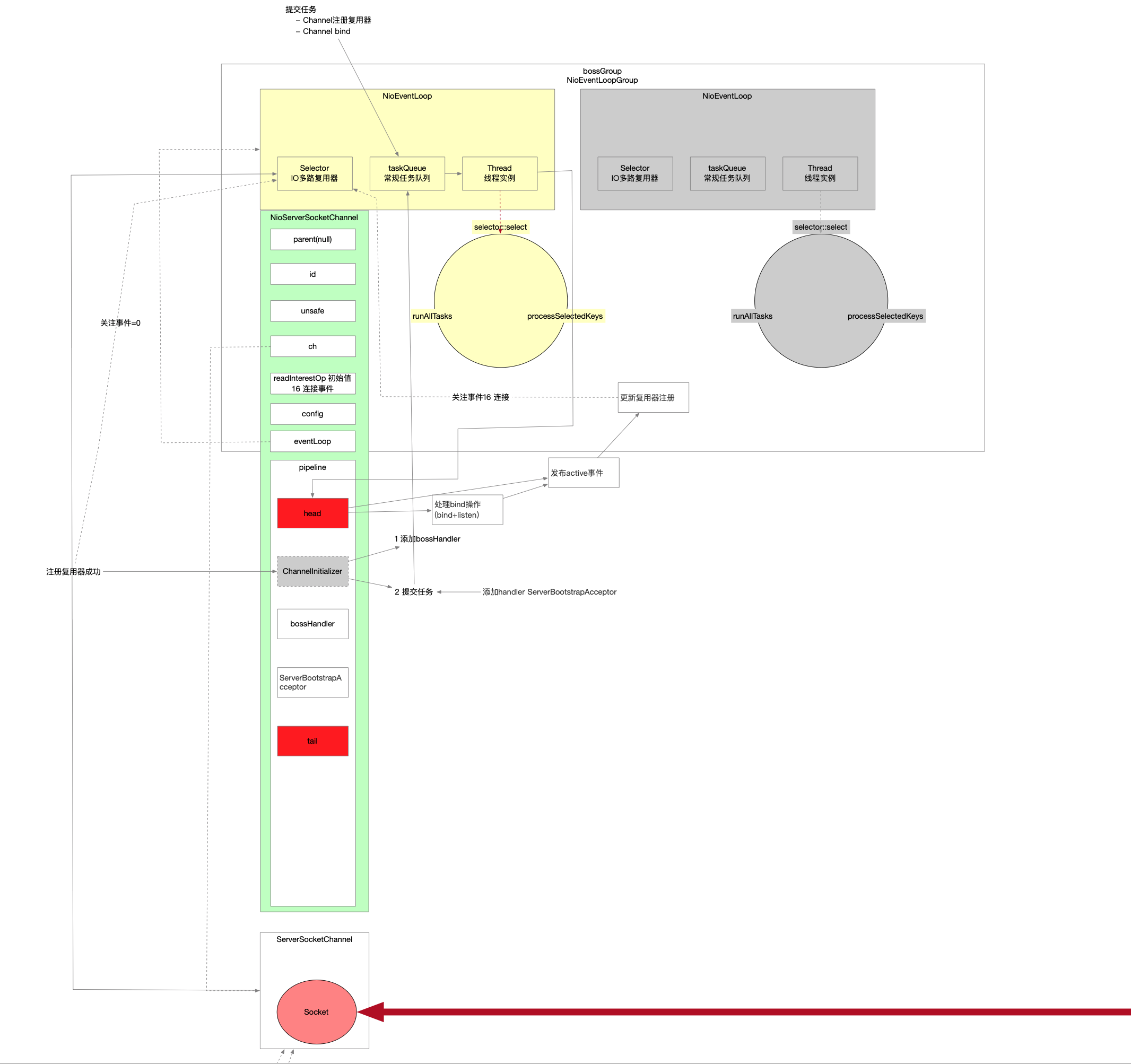 /** * Channel注册复用器是NioEventLoop线程的异步任务 * 这里是为了保证注册复用器的操作先于bind * - 复用器注册完触发ChannelInitializer方法回调 向pipeline中添加必要的handler 保证后续发生读写时 Channel都能依赖上完整的handler链 * - 前一个复用器注册时异步执行 * - 如果已经复用器注册已经完成 pipeline中handler已经初始化好 向NioEventLoop提交任务让它执行bind * - 如果复用器注册还没完成 说明这个任务还在NioEventLoop的任务队列taskQueue中 这个时候再向NioEventLoop提交一个异步任务 这两个任务的顺序通过任务队列保证了相对顺序 */ if (regFuture.isDone()) { // At this point we know that the registration was complete and successful. ChannelPromisepromise= channel.newPromise(); doBind0(regFuture, channel, localAddress, promise); // 此时Channel已经跟NioEventLoop线程绑定了 给boss线程添加个任务 让boss线程执行bind操作 这个地方也是真正启动boss线程的时机 return promise; } else { // Registration future is almost always fulfilled already, but just in case it's not. finalPendingRegistrationPromisepromise=newPendingRegistrationPromise(channel); regFuture.addListener(newChannelFutureListener() { // nio线程注册复用器是异步操作 给这个操作加个回调 等nio线程完成注册复用器之后 让它执行doBind0(...) @Override publicvoidoperationComplete(ChannelFuture future)throws Exception { Throwablecause= future.cause(); if (cause != null) { // Registration on the EventLoop failed so fail the ChannelPromise directly to not cause an // IllegalStateException once we try to access the EventLoop of the Channel. promise.setFailure(cause); } else { // Registration was successful, so set the correct executor to use. // See https://github.com/netty/netty/issues/2586 promise.registered();