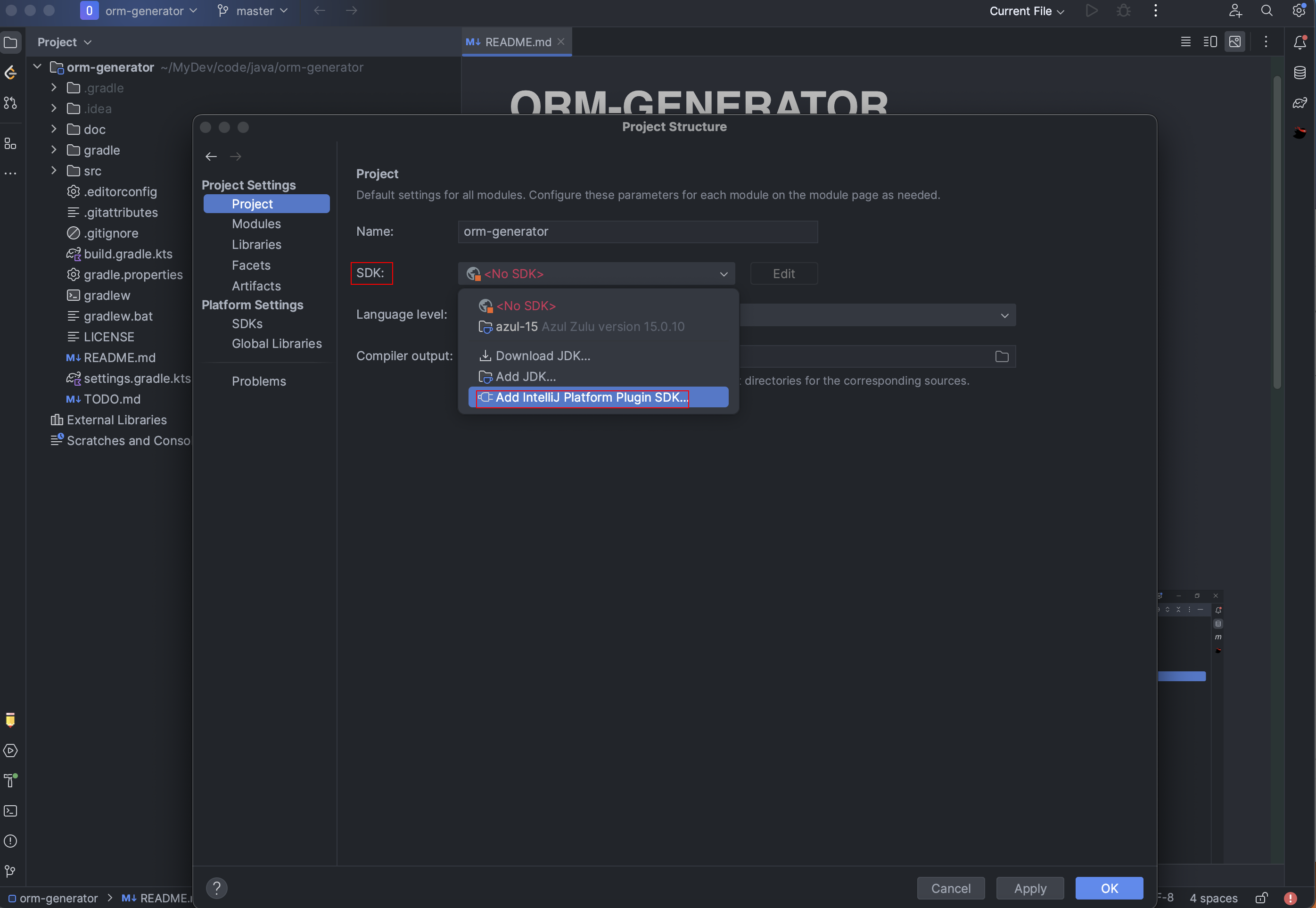 为当前项目配置SDK(jetbrains提供的platform devkit)。