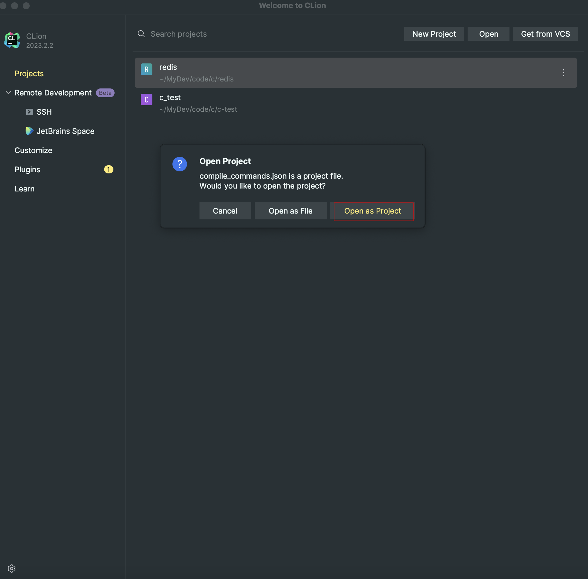 Clion以项目形式打开该文件