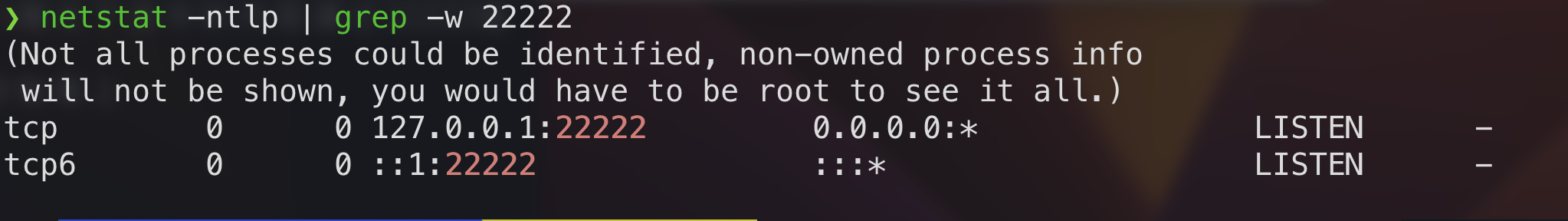 验证远程机端口转发功能netstat -ntlp | grep -w 22222