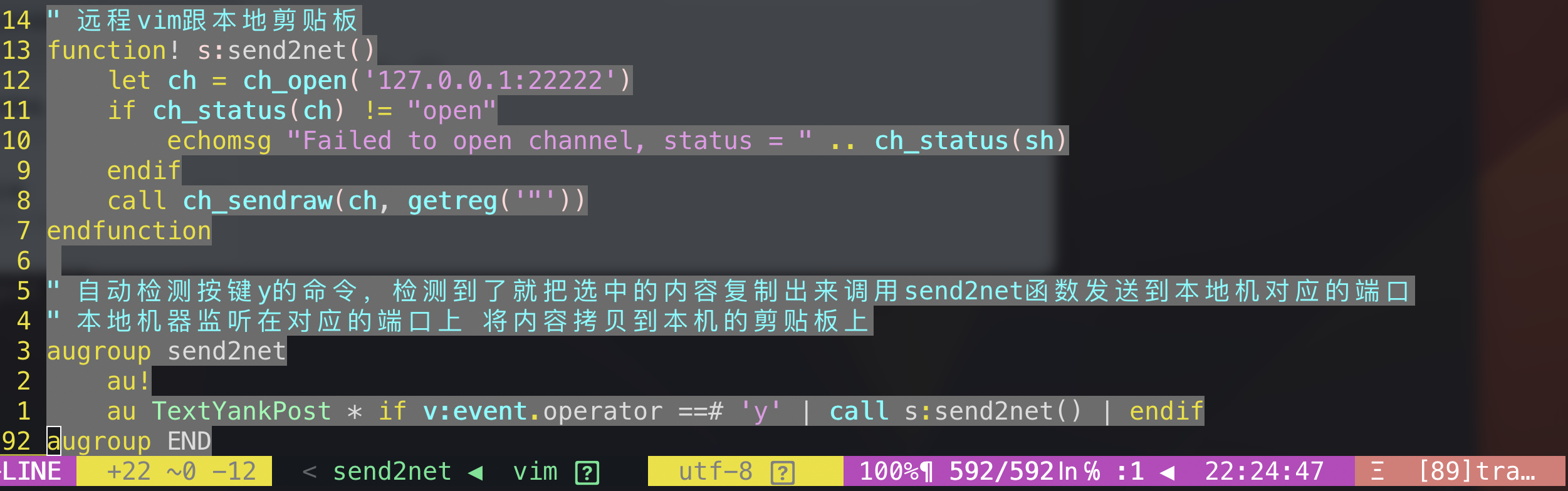 vim的visual模式下检测到TextYankPost指令就将选中内容发送到socket端口上,即通过数据通道从服务机发送到本地。