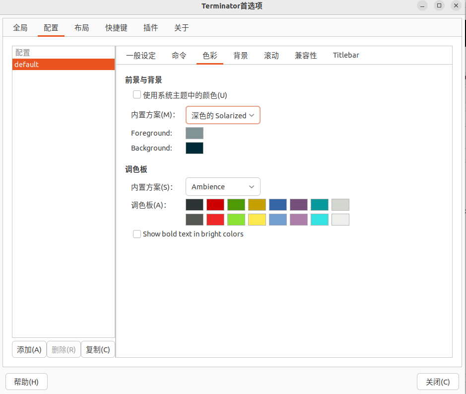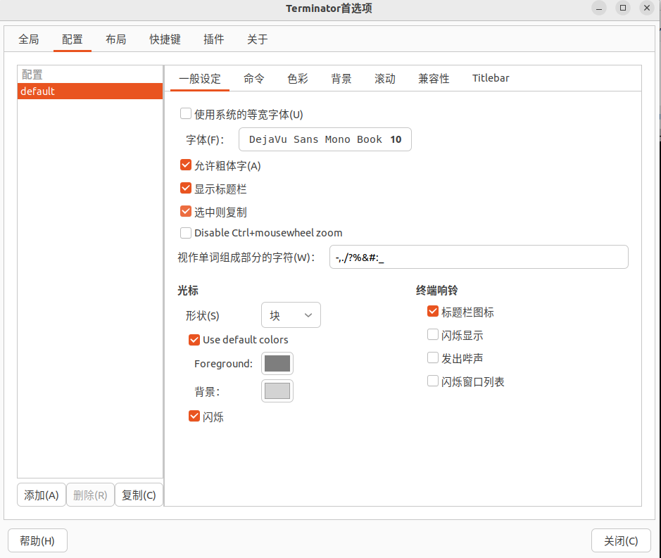 3.3.1 install 1 2 3 sudo add-apt-repository ppa:gnome-terminator sudo apt update sudo apt install terminator