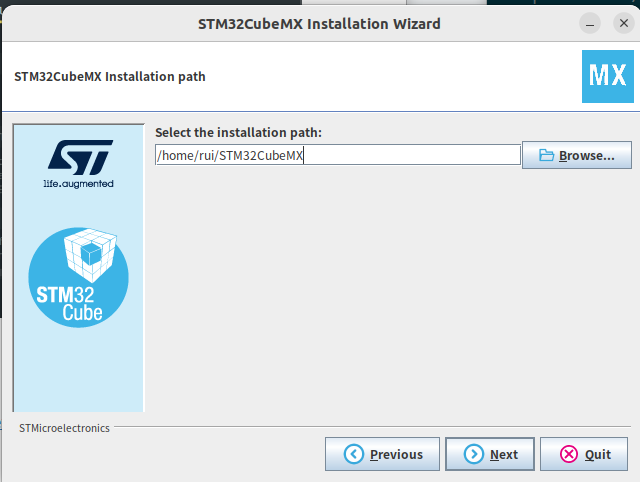 3.12.2 安装 1 2 3 4 5 6 cd Documents/softWare mkdir -p stm && cd stm cp ~/Downloads/en.stm32cubemx-lin-v6-9-1.zip ./ unzip en.stm32cubemx-lin-v6-9-1.zip rm -rf *.zip ./SetupSTM32CubeMX-6.9.1